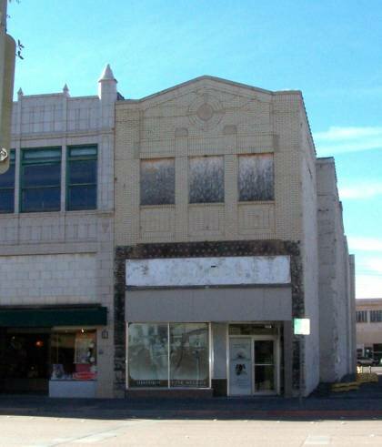 This is a 2-story, 3-bay rectangular commercial building in the 20th Century Commercial style with Art Deco influences built in 1914. The foundation is undetermined. Exterior walls are original brick. The building has a low front gable roof clad in corrugated metal.