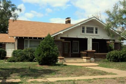 This is a 2-story, 3-bay house in the Eclectic style with Prairie School influences built in 1926. The foundation is undetermined. Exterior walls are original brick. The building has a hip with center gable roof clad in original pressed/patterned metal with box cornice and one hip-roofed dormer. There is one off center in front, exterior, brick chimney. Windows are original wood, 6/1 double-hung sashes. There is a single-story, single-bay open porch characterized by a flat with balcony roof with square brick posts.
