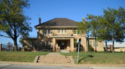 This is a 2-story, 5-bay domestic: Institutional Housing building in the Prairie School style built in 1929. The foundation is undetermined. Exterior walls are original brick. The building has a high hip roof clad in replacement asphalt shingles with box cornice. There is one side left, exterior, brick chimney and one side right, exterior, brick chimney. Windows are original wood, Prairie style grid/1 double-hung sashes. There is a single-bay open porch characterized by a flat with balcony roof with square brick posts. There are single story rooms with a roof terrace on each side of the house.