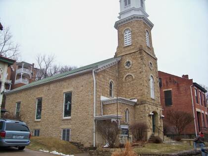 This is a multi-story church in the Romanesque Revival style built in 1838. The foundation is sandstone. Exterior walls are sandstone. The building has a front-gable roof clad in metal. Windows are stained glass. The original wIndows were made of opaque yellow glass. The stained glass windows you see today were installed between 1890-1910. They are made of Belgium stained glass with the colors fired in rather than painted on. Doors are original wood paneled.