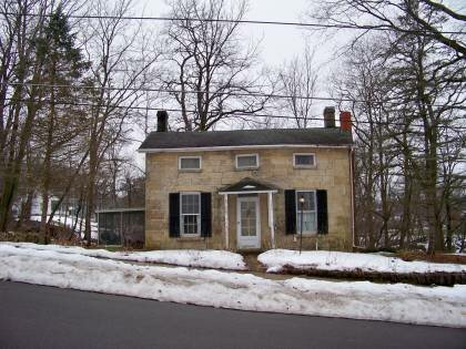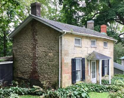 This is a 1.5-story domestic building built ca. 1840. The foundation is limestone. Exterior walls are limestone. The building has a side-gable roof clad in asphalt shingles. Windows are original wood 6/6; 3-light double-or single hung. The porch is original or historic, Less than full-height entry; Wood materials; Half-hipped roof; Square supports. Doors are original/historic wood paneled with transom.