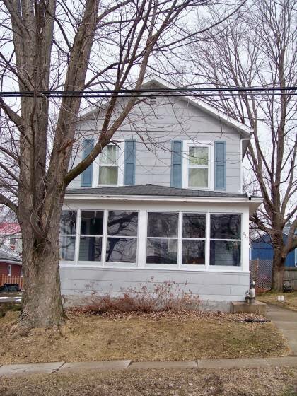 This is a 2-story domestic building built ca. 1900. The foundation is limestone. Exterior walls are asphalt siding. The building has a front-gable roof clad in asphalt shingles. Windows are original wood 3/1 fixed, double- or single-hung, ribbon. The porch is contemporary, Enclosed; Deck roof. Doors are contemporary wood glazed.