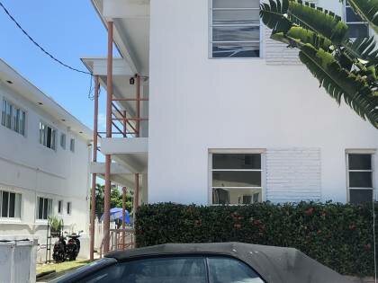 This is a 2-story multi-family residence in the Post War Modern style built in 1950. The structural system is cbs iii. The foundation is spread footing. Exterior walls are stucco and stone veneer. white stucco with white stone veneer. The building has a flat roof. Windows are awning.