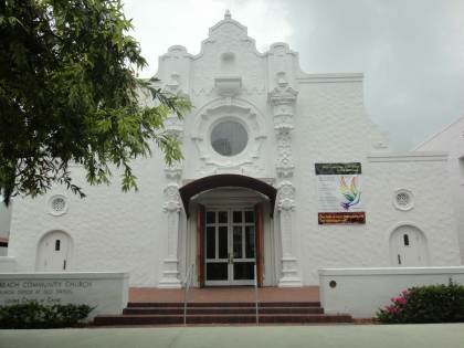 This is a 2-story church in the Mediterranean Revival style built ca. 1920. The structural system is concrete block stucco. The foundation is concrete pile. Exterior walls are original stucco and original stucco. The building has a gable roof clad in replacement clay barrel tile. Windows are replacement aluminum fixed. The primary entryway is double doors recessed and elevated on the north elevation. The right and left of the primary entry also have an arched wooden door opening.