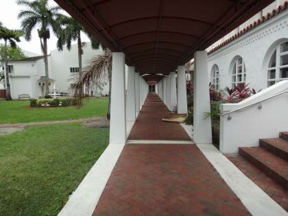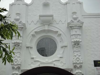 colonnade; clay barrel tile roof; ornamental window; circular ornamented vents; decorative elements above entrance; elevated entryway; niche & vent; segmental arch opening; arched windows; symmetrical north facade;
