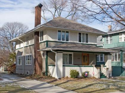 This is a 2-story single-family residence in the Prairie School style built in 1913. The structural system is frame/stucco. Exterior walls are original wood clapboard and original stucco. The building has a hip roof clad in replacement asphalt shingles. There is one side left, exterior, brick chimney. Windows are original wood, 1-light casements. There is a single-story, full-width open porch characterized by a hip roof clad in asphalt shingles with square stuccoed posts. There is a two-story, rear, frame/stucco addition. Residential addition.