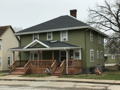 This is a 2-story, 2-bay house in the Prairie School style built in the period 1900-1909. Exterior walls are original wood siding. The building has a high hip roof clad in replacement asphalt shingles. There is one offset right, side slope, brick chimney. Windows are original wood, 8/1 double-hung sashes. There is a single-story, full-span open porch characterized by a hip-and-gable roof clad in asphalt shingles with square wood posts. Porch deck and supports replaced.