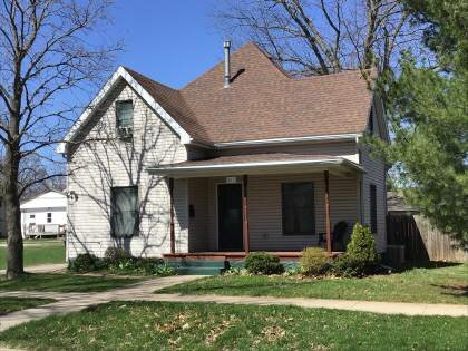 This is a 1.5-story, 3-bay house in the Queen Anne style built in the period 1900-1909. The foundation is rusticated concrete block. Exterior walls are replacement vinyl siding. Window trim removed. The building has a hip and gable roof clad in replacement asphalt shingles. There is one center, front slope, metal pipe chimney. Windows are replacement vinyl, 1/1 double-hung sashes. There is a single-story, two-bay open porch characterized by a shed roof clad in asphalt shingles with modern turned wood posts on rectangular rock face block piers.