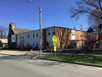 Typical mid-century Catholic parochial school with cubic Modernist design. Sits next to the parish's simple red brick church building. Building is a fairly typical example of mid-20th century Catholic institutional architecture. School is not connected to church.