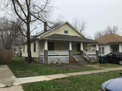 This is a 1.5-story, 3-bay house in the Craftsman style built in the period 1910-1919. The foundation is rusticated concrete block. Exterior walls are replacement vinyl siding. The building has a medium front gable roof clad in replacement asphalt shingles. There is one offset left, side slope, brick chimney. Windows are replacement vinyl, 1/1 double-hung sashes. There is a single-story, full-span open porch characterized by a hip roof clad in asphalt shingles with short battered wood posts on square rock face block piers.