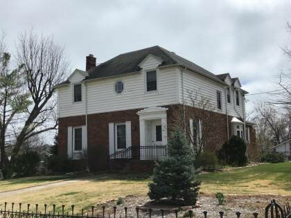 This is a 3-story, 3-bay house in the Colonial Revival style built in the period 1880-1889. The foundation is undetermined. Exterior walls are replacement vinyl siding and original brick. The building has a high hip roof clad in replacement asphalt shingles and four gabled dormers. There is one center, rear slope, brick chimney and one offset right, exterior, brick chimney. Windows are replacement vinyl, 6/6 double-hung sashes. No porch, appears to have been removed in past.