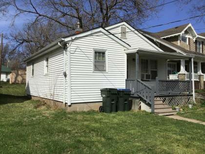 This is a 1-story, 3-bay house in the Minimal Traditional style built ca. 1950. The foundation is concrete block. Exterior walls are replacement vinyl siding. The building has a medium front gable roof clad in replacement asphalt shingles. There is one center, straddle ridge, brick chimney. Windows are original wood, vertical 4/1 double-hung sashes. There is a single-story, two-bay porch characterized by a shed roof clad in asphalt shingles with square wood posts on square wood piers.