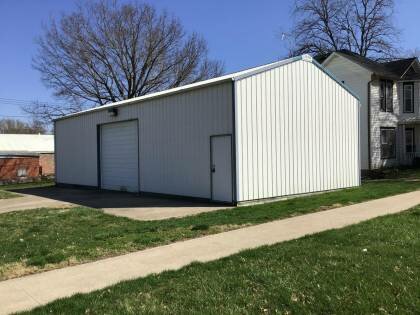 This is a 1-story, 2-bay pole barn built in the period 2010-2019. The foundation is poured concrete. Exterior walls are original metal. The building has a low side gable roof clad in original corrugated metal. No chimney is present. There are no windows. Center garage door and offset man door.
